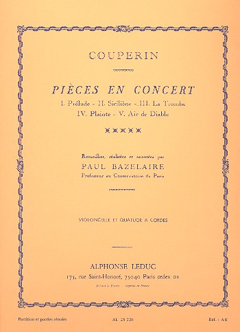 Couperin Pieces en Concert for Cello & String Quartet. Compiled & Edited by Paul Bazelaire Score and Parts. Prelude; Sicilienne; Tromba; Plainte; Air de Diable