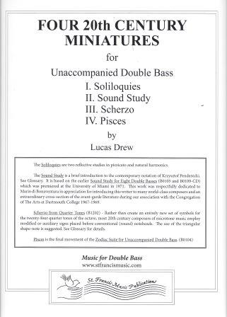 Drew Four 20th Century Miniatures for Unaccompanied Double Bass: 1. Soliloquies; 2. Sound Study; 3. Scherzo; 4. Pisces