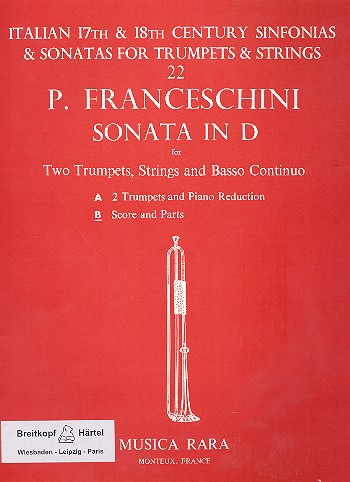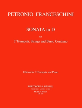 Franceschini Sonata in D Major for 2 Trumpets, Strings, and Basso Continuo. Edited by Edward H. Tarr. Reduction for 2 Trumpets and Piano.