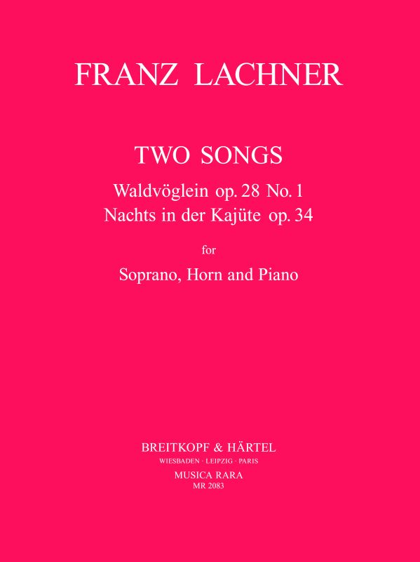 Lachner Two (2) Songs for Soprano, Horn (or Cello), and Piano: Waldvoglein, Op. 28, No. 1 & Nachts in der Kajute, Op. 34. Piano Playing Score + Parts.