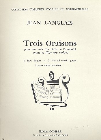 Langlais Trois Oraisons for Solo Voice (or Unison Choir), Organ, and Flute (or Violin). 1 - Salve Regina; 2 - Jam sol recedit igneus; 3 - Jesu dulcis memoria.