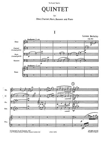 Lennox Berkeley Quintet, Op. 90, for Oboe, Clarinet, Horn, Bassoon, and Piano. Score and Parts.
