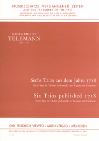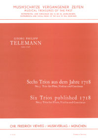 Telemann Trio No. 5 (From 6 Trios Published 1718), for Violin, Viola, and Basso Continuo. Urtext of the Original Publication. Score and Parts.