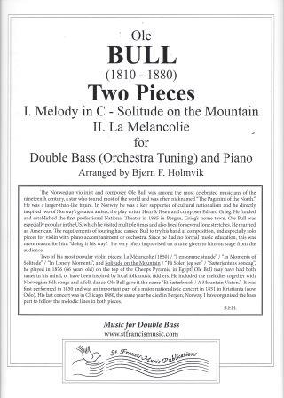 Bull (John) Two (2) Pieces for Double Bass (Orchestra Tuning) and Piano: 1. Melody in C -Solitude on the Mountain; 2. La Melancolie: Arranged by Bjorn F. Homvik