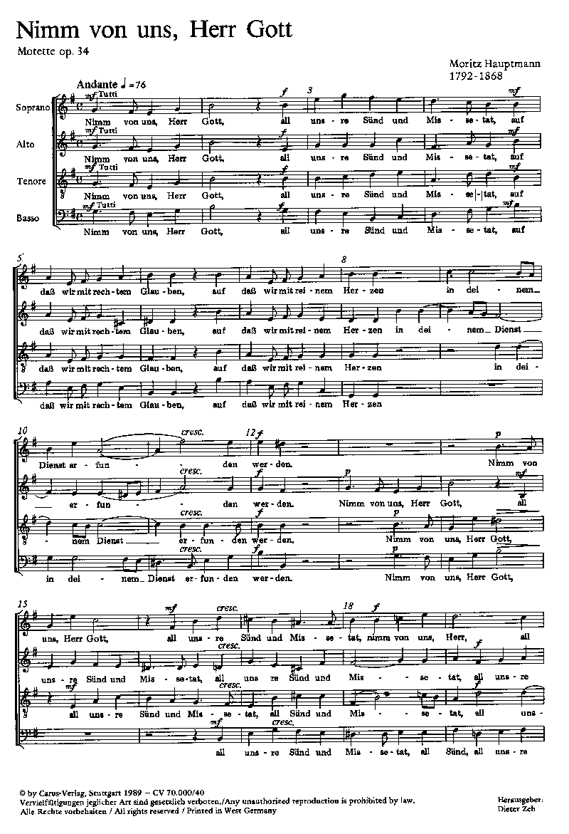 Hauptmann (Moritz) Nimm von uns, Herr Gott. Motet, Op. 34, for SATB Chorus, Unaccompanied
