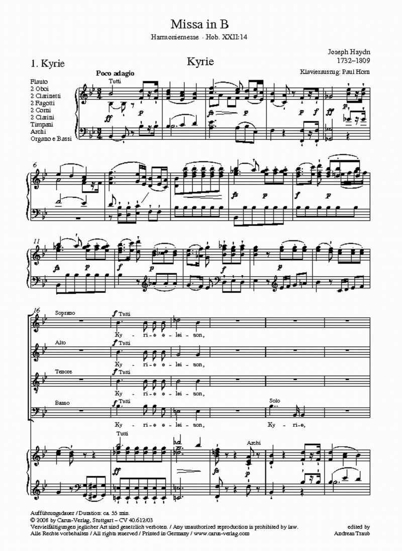 Haydn Mass No. 14 in B-Flat Major ("Harmoniemesse"), Hob. XXII:14, for SATB Soloists, SATB Chorus, & Orchestra. Urtext Edition by Andreas Traub. Vocal Score