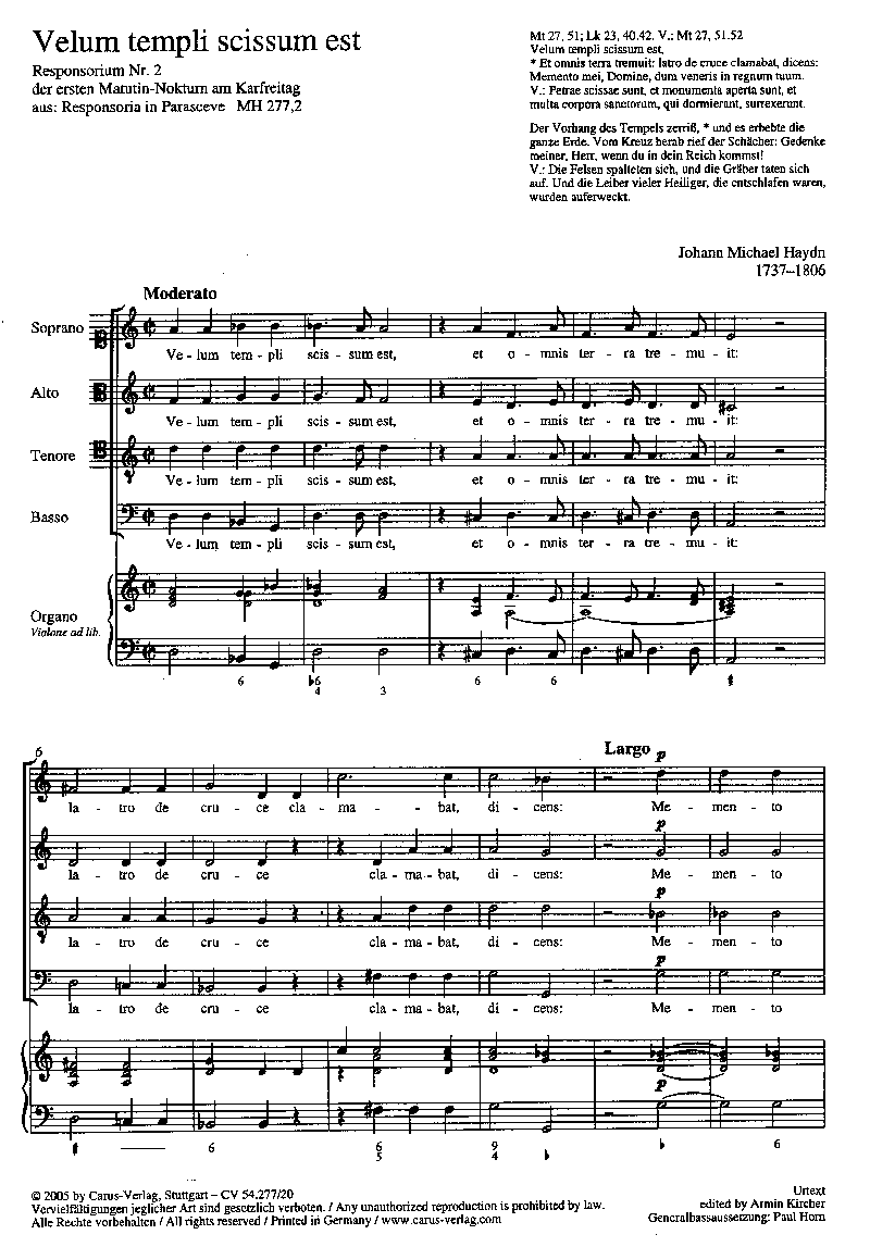 J.M. Haydn Velum templi scissum est (Responsory No. 2 for the Matins of Good Friday), for SATB Choir, Organ, Violone. Edited by Armin Kircher.