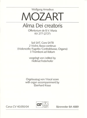 Mozart Alma Dei Creatoris, K. 277, for SAT Soloists, SATB Choir, 2 Violins & Basso Continuo (3 Trombones ad lib.). Choral Score with Soloists Parts.