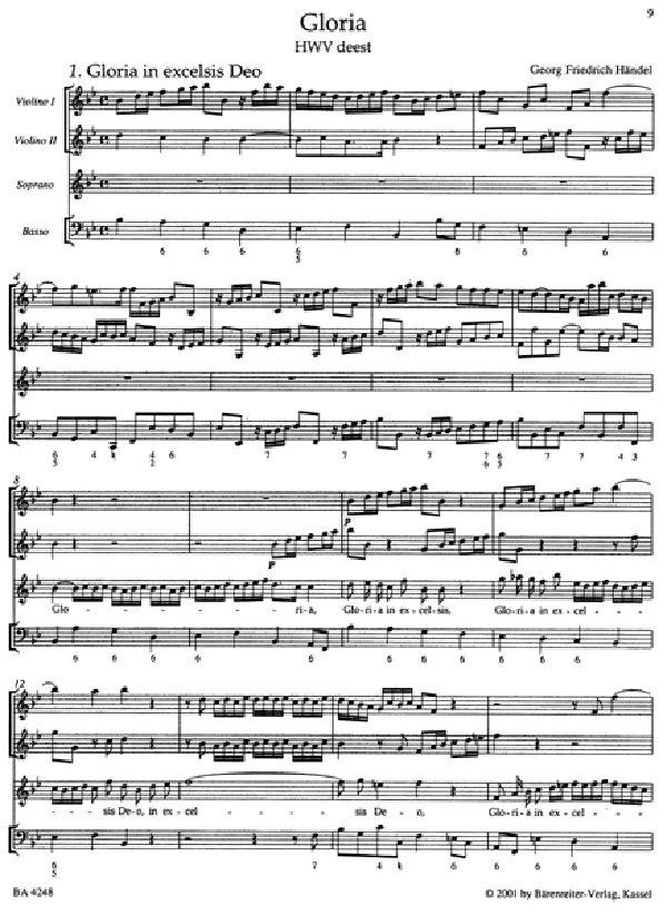 Handel Gloria, HWV deest, for Soprano Solo, Strings, & Basso Continuo (Organ). Edited by Hans Joachim Marx. Violin 1+2 Part.