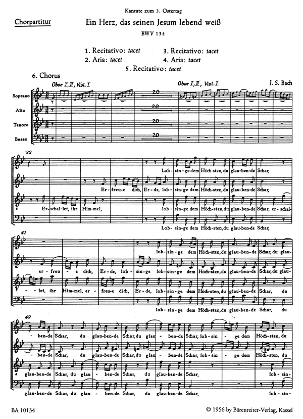 Bach Cantata 134: Ein Herz, das seinen Jesum lebend weiß, BWV 134, Choral Score