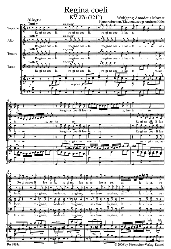 Mozart Regina Coeli, K. 276, for SATB Soloists, Mixed Choir, and Orchestra. Urtext Edition by Helmut Federhofer. Vocal Score