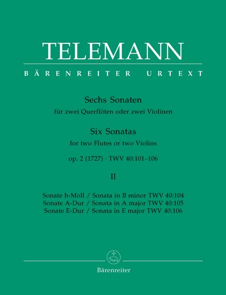 Telemann 6 Sonatas, Op. 2, for 2 Flutes (or Violins), Vol. 2: Sonatas No. 4 in B Minor, 5 in A Major, 6 in E Major, TWV 40:104-106 (Playing Score)