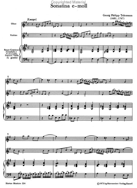 Telemann Sonatina in E Minor for Oboe, Violin, & B.C., TWV 42:e5 (Score & Parts)