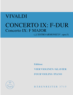 Vivaldi Concerto in F Major, Op. 3, No. 9 (from "L'Estro armonico"), for 4 Obbligato Violins, 2 Violas, Cello, & Basso Continuo. Reduction for 4 Violins & Piano