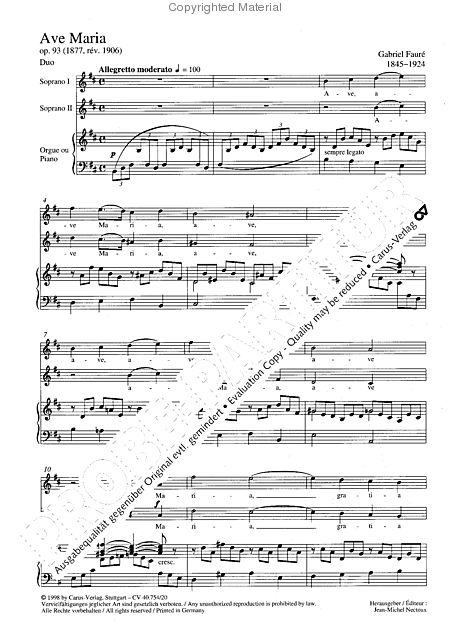 Faure Ave Maria in B Minor, Op. 93, for 2 Soprano Soloists and Piano or Organ