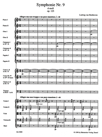 Beethoven Symphony No. 9 in D Minor, Op. 125 (with Final Chorus "An die Freude"), for Solists, Choir, & Orchestra. Urtext Ed. by Jonathan del Mar. Study Score